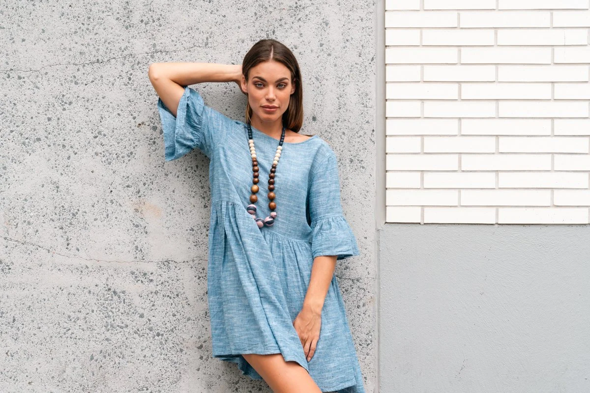 A woman in a blue dress with puffed sleeves and a beaded necklace stands against a textured concrete wall and a white brick wall.