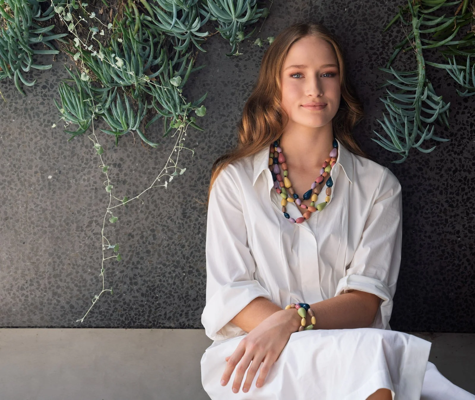 A young woman with long wavy brown hair, wearing a white shirt and beige beaded necklaces, smiling softly outdoors with greenery in the background.