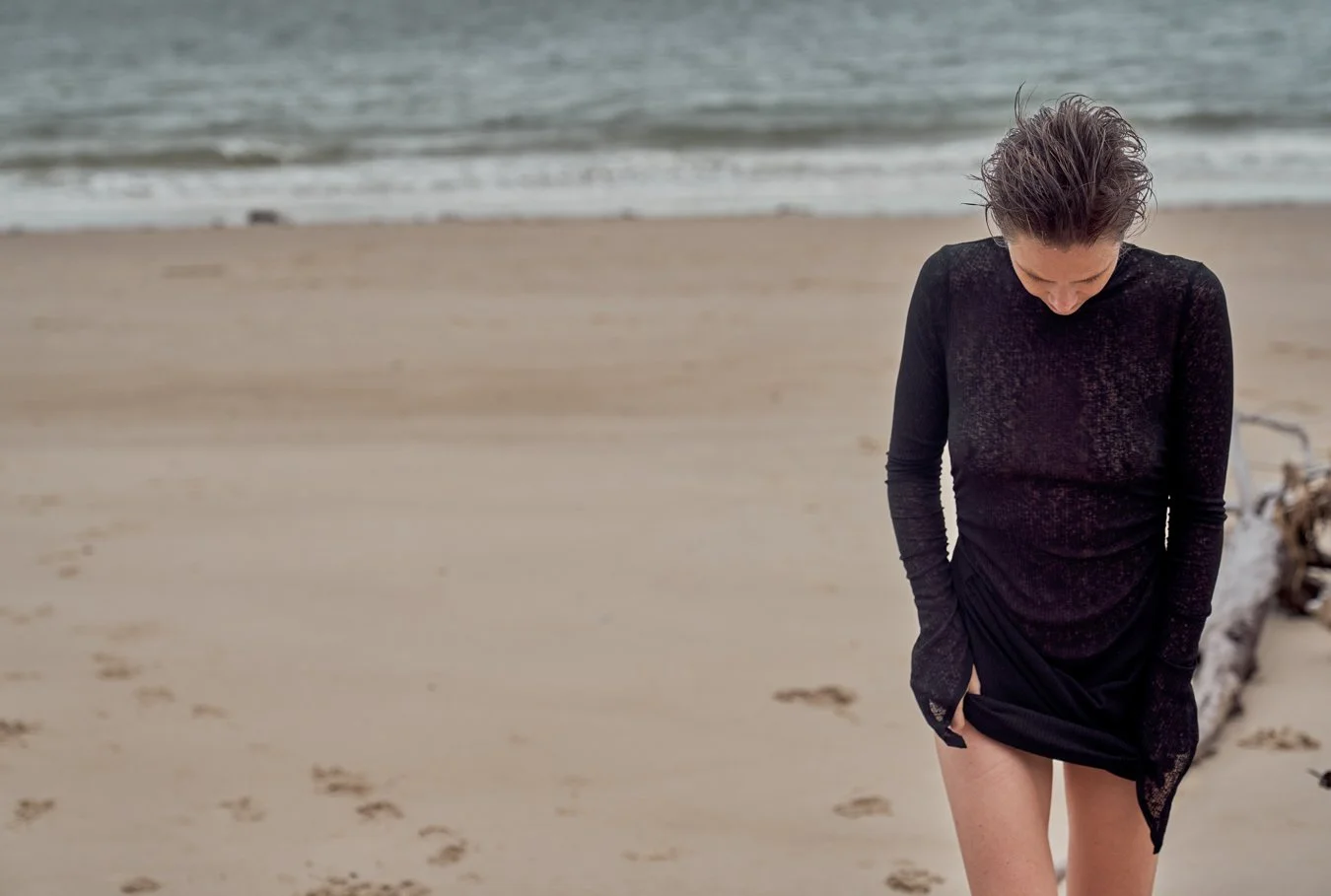 Woman in a black dress standing on a sandy beach, with the ocean in the background.